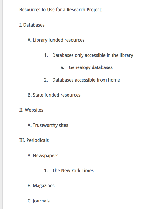 Here is an example of how a list may look incorporated into the prose of a research project or assignment: