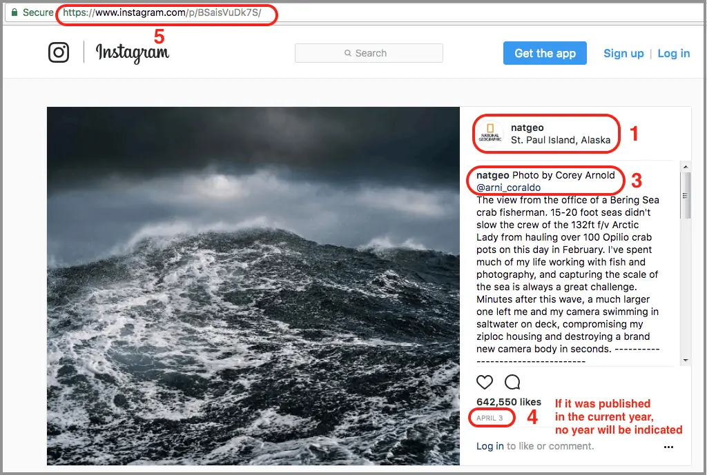 To help make the process a little easier to understand, we’ve included an example (a cool nature photo that was reposted on National Geographic’s Instagram account from photographer Corey Arnold’s account).