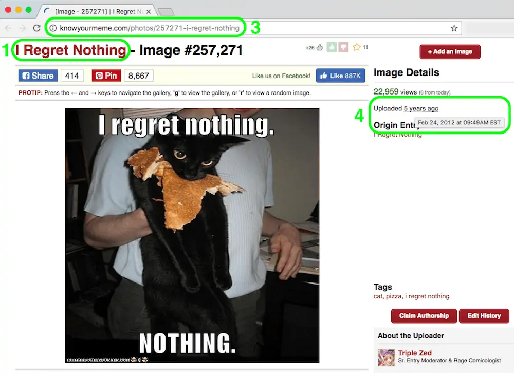 For our examples, let’s look at the meme “I Regret Nothing” found at https://knowyourmeme.com/photos/257271-i-regret-nothing.
