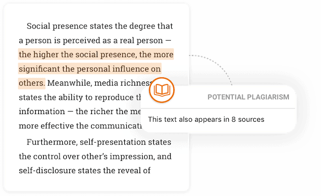 Worried about plagiarism? After getting a grammar check, you can easily run a plagiarism check with just a few clicks. The plagiarism checker compares your paper to billions of sources and detects plagiarism. If the checker spots similar phrasing, it lets you know right away, so you can rephrase your words or use a direct quote.