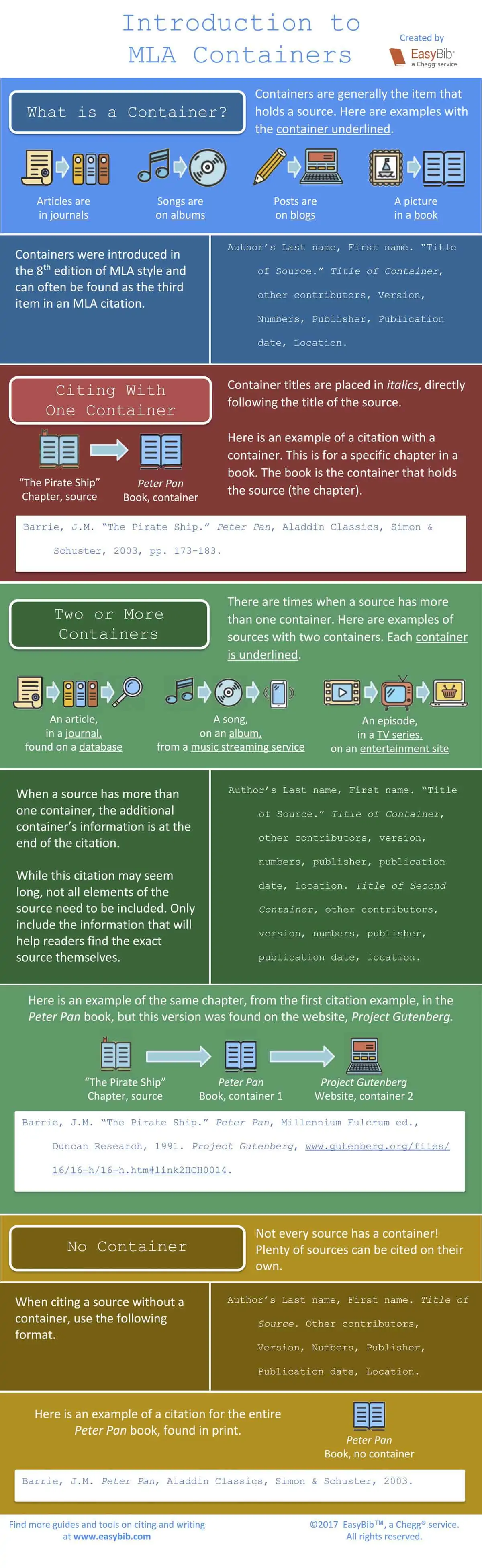 When MLA 8th edition was released in 2016, it changed MLA’s approach to citing. No longer do writers and researchers have to conform citations around a source type; MLA format now centers around a standard set of elements for all source types. With this new approach was also a new concept: Containers.