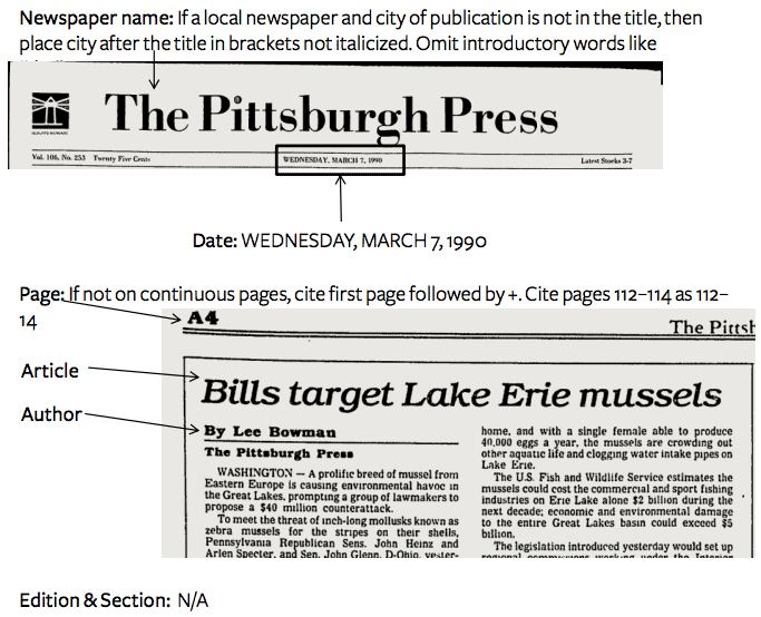 Last, First M. “Article Title.” Newspaper Title [City], Day Month Year published, section name (if applicable), p. page number. |